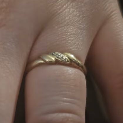 Gullring i 14 karat/SE 585. Se bilde for størrelse, ser ut til å være 16 mm, noe som tilsvarer størrelse 50 ☺️ Har ett navn inngravert på innsiden. Passer godt til både mann og kvinne ☺️🌸