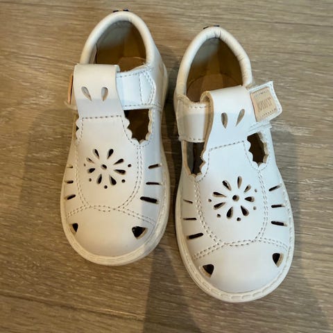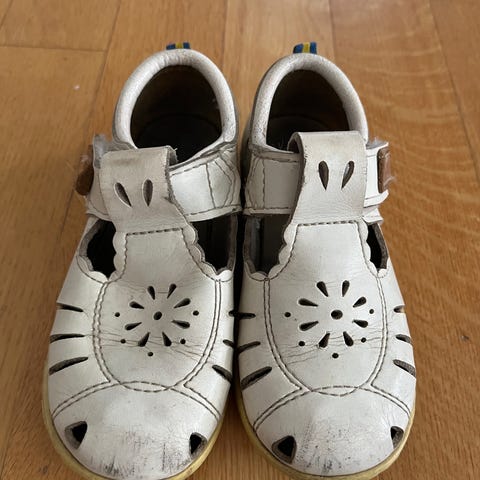 Kavat sandaler for barn i størrelse 23. Modellen er i hvitt skinn med utskårne detaljer i overdelen for lufting. Sandalene har lukket tå og hæl, samt justerbar borrelåsrem over vristen for enkel tilpasning. Yttersålen er i gummi med lett mønster for grep. Unisex-modell som passer til både innendørs og utendørs bruk i varmere vær.