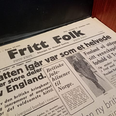 Original utgave av den norske okkupasjonsavisen Fritt Folk, utgitt i Oslo 1. desember 1943, med forsideomtale av sabotasjeaksjoner i Oslo.