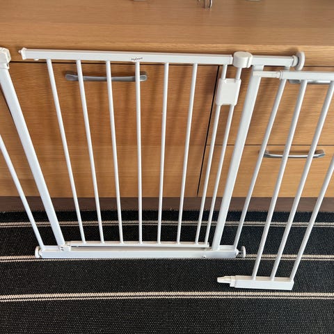 Hvit trappegrind i metall. Passer til sikring av trapp og gjennomganger i hjemmet. Justerbar bredde.