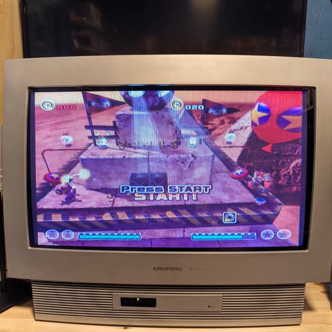 Grundig CRT-TV med integrerte høyttalere i front. Klassisk billedrørsskjerm egnet for bruk med eldre spillkonsoller, videoavspillere. Fysiske knapper for betjening er plassert på fronten av apparatet.