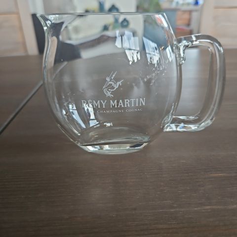 Martell keramikkmugge i blått. Muggen har rektangulær form med helletut og hank, og teksten "Martell Cognac" på siden. Egnet som serveringsmugge eller som dekor på bar, kjøkken eller samlerhylle.