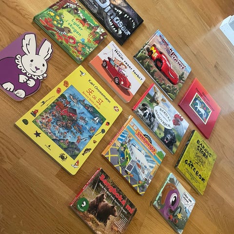 Blandet pakke med barnebøker bestående av ulike billedbøker, høytlesningsbøker og aktivitetsbøker. Bøkene har varierte temaer som eventyr, årstider, dyr, alfabet, rim og regler, samt fortellinger for barn i barnehage- og småskolealder. Formatene varierer mellom hardcover og myke permer, og bøkene har illustrerte sider tilpasset barn. Egner seg til høytlesning, egenlesing og som inspirasjon til aktiviteter og lek for barn i ulike aldre.