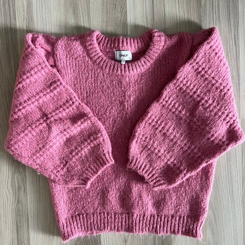 Selected Femme genser for dame i størrelse L. Genseren er rosa og strikket i mohair, ull og akryl. Den har rund hals, lange ermer og ribbekanter nederst, på ermer og i halsåpning. Kan styles opp og ned.