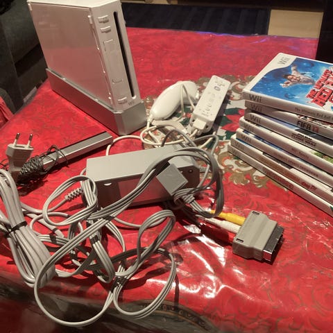 Nintendo Wii spillkonsoll med kontroller og kabler + 5 Spill