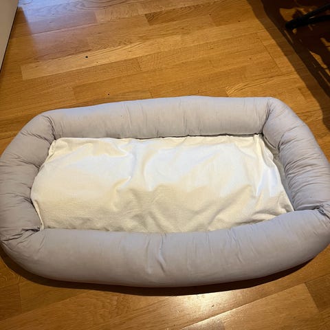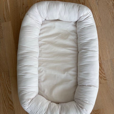 Babynest fra BabyDan med myk, lyse grå polstret kant rundt hele den hvite liggeflaten. Avlang, oval form, mål ca 85 x 50 x 12 cm (bøyelig). Undersiden åpnes med borrelås for å komme til skumgummimadrassen. Egnet som trygg og avgrenset sove- og liggeplass for spedbarn, for eksempel i seng, sofa eller på gulv, under tilsyn av voksen. Tåler vask i maskin.