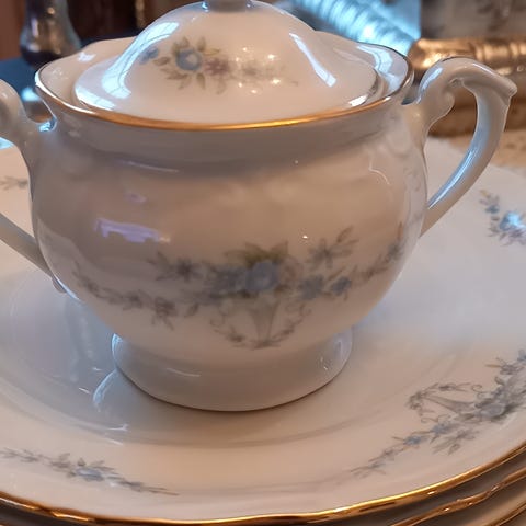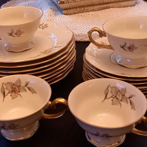 Tysk service. 3 asjetter, 5 skåler ,4 kopper, sukker kopp og fløte mugge. BUD