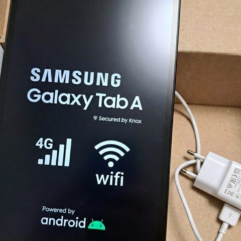 Samsung Galaxy Tab A nettbrett med 32 GB intern lagring. Nettbrettet har berøringsskjerm og kjører Android-operativsystem. Enheten egner seg til bruk som nettbrett til surfing, streaming, enkle spill og apper. Lagringskapasiteten på 32 GB gir plass til apper, bilder og dokumenter, og kan på enkelte modeller utvides med minnekort (avhenger av spesifikk variant). Strømadapter og USB-kabel følger med på bildene.