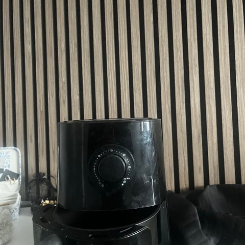 IKEA airfryer i svart. Luftfrityrkoker med justerbar temperatur via dreiehjul på fronten. Kurv og innsats kan tas ut for enklere rengjøring. Strømkabel med jordet kontakt. Egnet til tilberedning av ulike typer mat med mindre bruk av olje enn tradisjonell frityr. Den er liten å passer til 1-3 personer i huset!