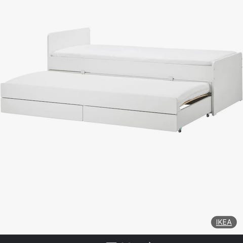IKEA SLÄKT uttrekksseng med oppbevaringsskuffer i hvit utførelse. Sengen består av en hovedseng med ribbebunn og en uttrekkbar ekstraseng under. Under den nederste sengen er det integrerte skuffer som gir ekstra oppbevaringsplass.
