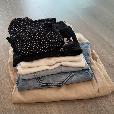 Kosebukse, genserjakke, T-skjorte, 2 bikinier, 1 badedrakt.