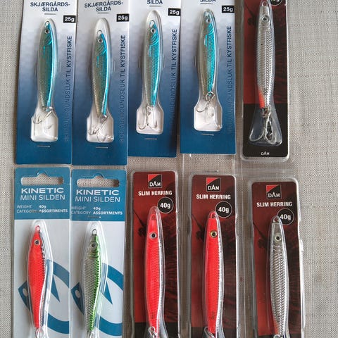 Diverse nye / velholdte sluker og utstyr for fiske i elv og sjø selges. Pakken inneholder i alt 15 store sluker i god kvalitet og diverse kroker, fortrinnsvis for fiske i elv eller sjø etter større laks, sjøørret og havfisk.