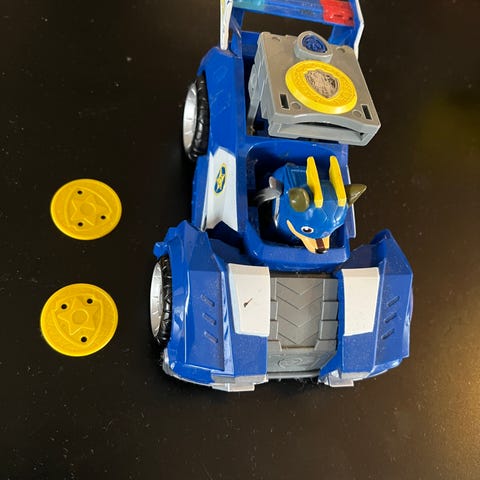 Paw Patrol lekebil redningsbil med kran i blå og gule plastdeler. Bilen har seks hjul og åpen førerkabin med plass til medfølgende figur. Bak på bilen er det en løftekran med vinsj og kurv som kan heves og senkes. Kjøretøyet har mange detaljer som frontlys, støtfanger og Paw Patrol-logo på siden. Egnet som lekekjøretøy for barn som liker Paw Patrol-tema og redningslek. Lilla Puma følger følger med.