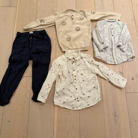 Sett består av to langermede overdeler og én bukse/leggings. Passer til hverdagsbruk for barn rundt størrelse ca 104. Pent brukt.