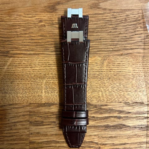 Berg Lakse herre klokkerem i mørk brunt ekte skinn. Remmen har preget mønster og klassisk spenne i metall. Passer til herreklokker som bruker standard utskiftbar rem i tilsvarende bredde (mål bredde ved festet på klokken for å sikre kompatibilitet). Remmen har flere hull for justering av lengde. 20mm