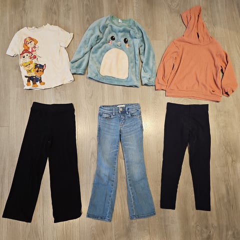 barneklær for jente i størrelse 116. Pakken inneholder ulike plagg i flerfargede varianter, blant annet overdeler med hette, bukser og jeans. Klærne passer til hverdagsbruk for barn i aktuell størrelse, og kan kombineres på ulike måter etter behov og sesong.