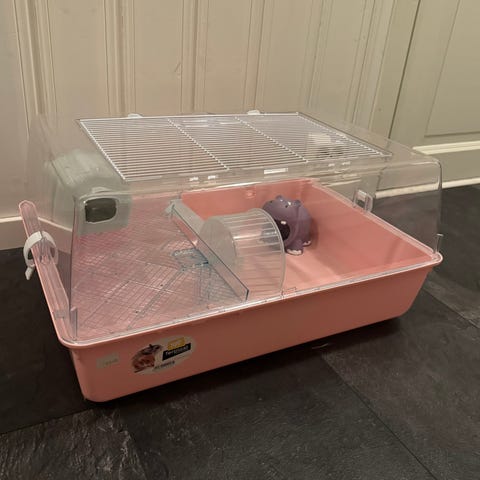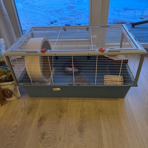 Buret er brukt av en gullhamster. Det er noen bruksmerker, men fungerer fortsatt veldig bra.