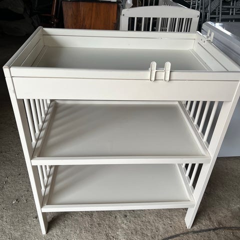 Kjøpte selv brukt og har nå gjort nytten sin hos oss. Stått kun som oppbevaring av klær og bleier en god stund nå, ellers lite brukt av oss 😊