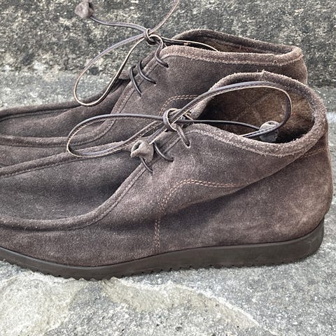 Mokkasiner i mørk brunt lær og høy såle (5 cm i størrelse 37). Kun brukt 1 gang, da til jobb.