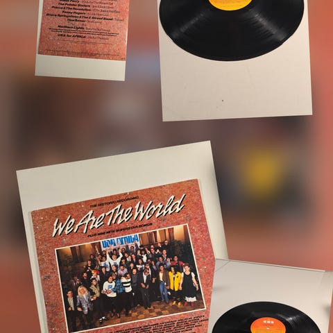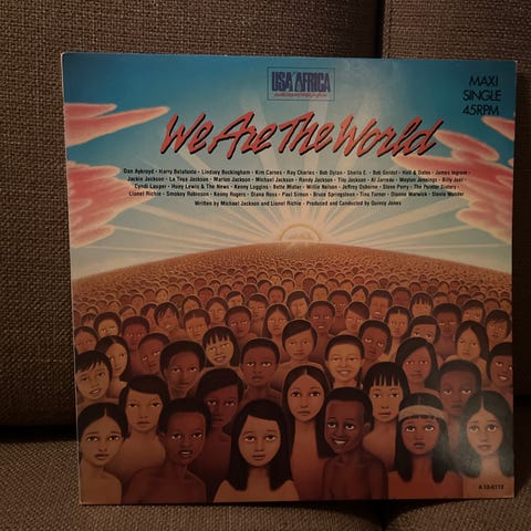 USA For Africa We Are The World LP vinylplate. Utgivelse på CBS Records med originalt plateomslag med illustrert forside og billedcollage av artistene på baksiden.