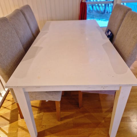 Solid hvitt spisebord i tre med 8 stoler. Gis bort mot henting. Ekstra klaff/lem på 45 cm gir to ekstra spiseplasser.