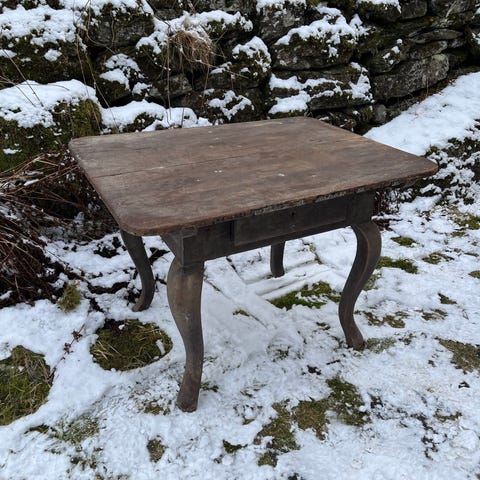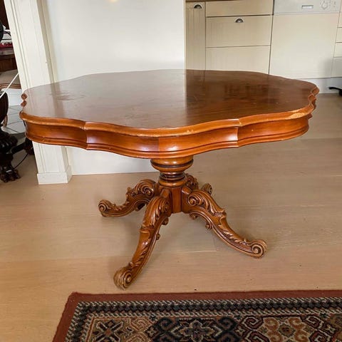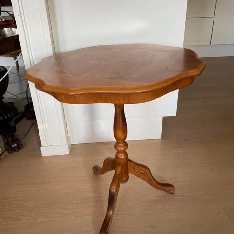 Salongbord i tre med utskårne detaljer og buede ben. Bordet har en brun treoverflate og klassisk stilutforming. Egner seg som sidebord eller salongbord i stue eller oppholdsrom.