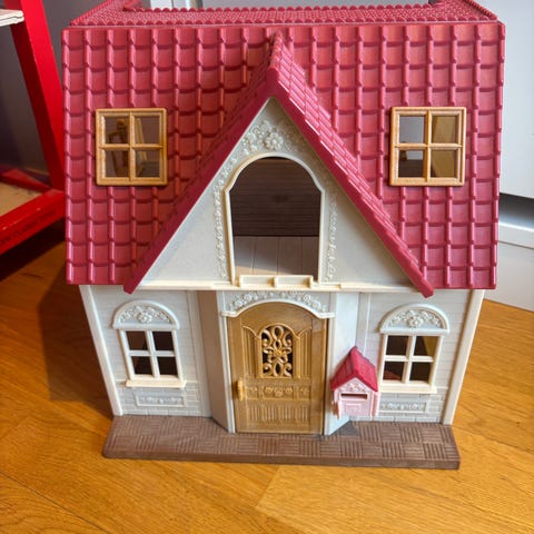 Sylvanian Families dukkehus i klassisk stil med to etasjer. Huset har flere vinduer og hoveddør som kan åpnes. Inne i huset følger det med diverse møbler, blant annet spisebord med benk og stoler, babyseng med sengetøy og uro, liten stol og sklie. Det følger også med flere små dyrefigurer som kan plasseres i de ulike rommene. Egnet som lekesett for barn som liker rollelek med dukkehus og miniatyrfigurer.