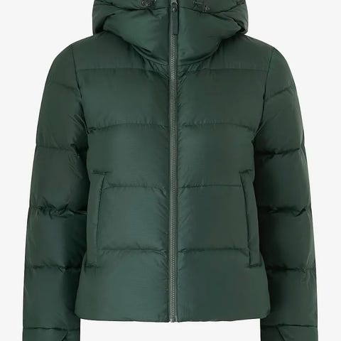 Jakken er grå og fylt med dun, noe som gir god isolasjon og lav vekt. Yttermaterialet er glatt og lett, med gjennomgående quiltet mønster. Jakken har hette, hel glidelås foran og lange ermer.
