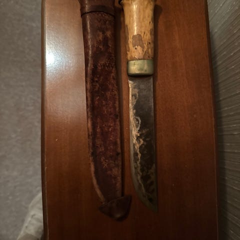 Sliren, knivbladet og skaftet for seg er i veldig god stand, men skaft og blad sitter ikke lenger sammen.