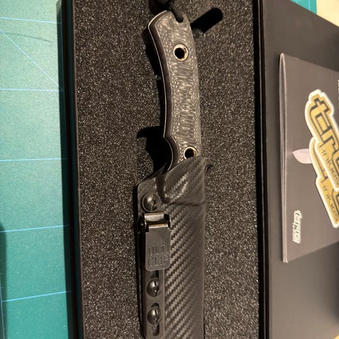 Håndtaket er utført i eksklusivt Night Storm Carbon Fiber, som gir lav vekt, høy styrke og et unikt visuelt preg. Leveres med luksuriøs italiensk skinnslire, som matcher knivens premium-nivå og gir trygg bæring.
