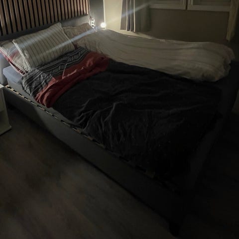 Seng fra IKEA med madrasser og sengegavl. Sengen er av typen Malm, men det ser ikke ut som denne selges lenger. Fire skuffer med hjul under sengen gir ekstra rom for oppbevaring. Ingen synlige merker. 2 madrasser + overmadrass. Kjøpt ny på Furuset i 2021/2022