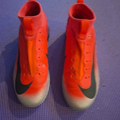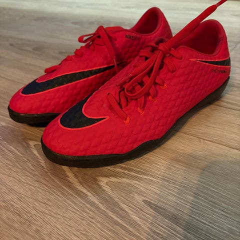Nike innendørs fotballsko i størrelse 38. Skoene har overdel i svart med hvite detaljer og rød innside. Yttersålen er laget for innendørs bruk, med gummisåle i naturgummi med røde og hvite felter for godt grep på innendørs underlag. Egnet til innendørs fotball og futsal.