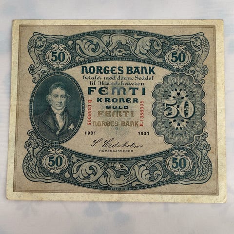 Baksiden viser en sølvkanne og teksten «Sølvskatten grunnlaget for Norges Bank 1816».