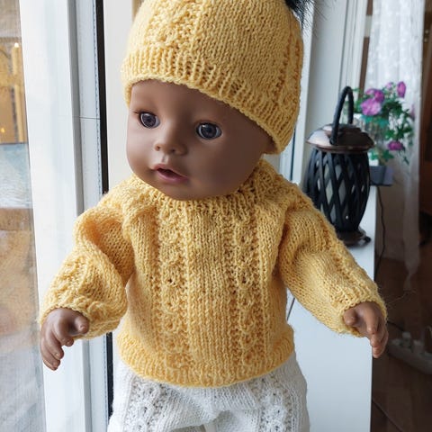Sett til Baby Born dukke, 375 kr. Genser, bukse og lue m/skinndusk, som kan tas av ved vask. Garn: Baby Merino 100 %% Ull. Porto kommer i tillegg.