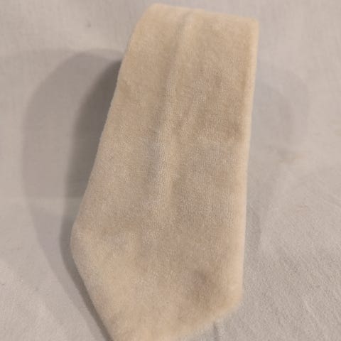 Vintage smalt slips i 100 % bomull med klassisk paisleymønster. Produsert i Sverige, fôret med viskose. Matt tekstiloverflate i lys krem med blå detaljer. Pent brukt og i god stand. Typisk sent 60-/tidlig 70-talls uttrykk.