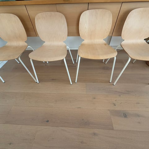 Selger 4 pent brukte stoler kjøpt på Ikea i 2021. I sortmalet tre, med sorte metallben. Utgått modell fra Ikea, modellen heter Sven-Bertil.