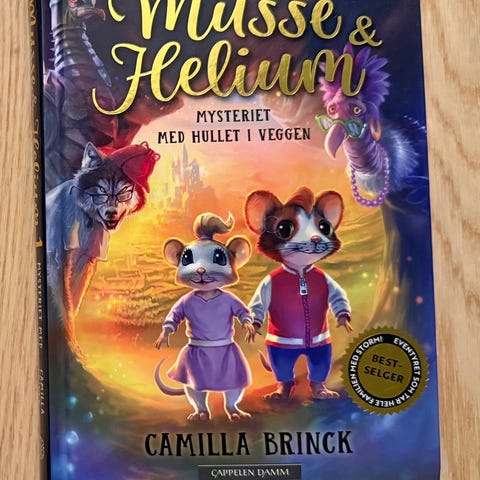 Camilla Brinck Musse og Helium Mysteriet med hullet i veggen bok. Barnebok med illustrert omslag, utgitt på Cappelen Damm. Boken følger karakterene Musse og Helium i et spenningsfylt eventyr. Trykt i innbundet utgave.