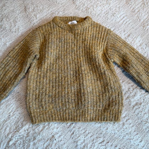 POMPdeLUX strikketøy for jente i størrelse 122/128. Strikketøyen er gulbrun og strikket i akryl-ull. Den har strukturstrikk med mønster foran, rund hals og ribbekanter på ermer, hals og nederkant.