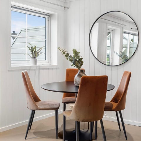Spisebord Ø105 tre/sort + 4 spisestoler sort imitert skinn