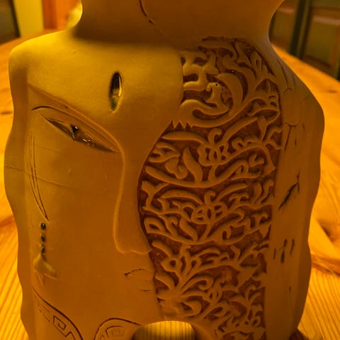 Keramikk vase i glasert keramikk i gråblå og hvit farge.