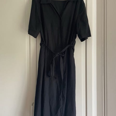 Hverdagskjole for dame i størrelse S. Modellen har krage, knepping foran og trekvart lange ermer. Det følger med knytebelte i livet for justering av passform. Lengden går omtrent til leggen, avhengig av høyde. Egner seg til hverdagsbruk og enkle anledninger. Selges billig da ene knappen nederst er falt av, men dette kan enkelt fikses og det er lite synlig