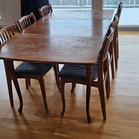 Kjempe fin og solid spisegruppe selges. Har litt bruksmerker fra glass. Lengden på bordet med ekstra platen oppe blir ca 165cm.