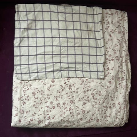 Laken med strikk i hjørnene i samme farge til stor dobbeltseng.