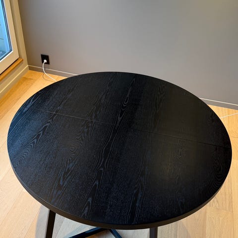 Selger pent brukt tre år gammelt Røa rundt spisebord Ø120cm. Kun et lite bruksmerke på 2 millimeter på den ene kanten på bordet, ellers er bordet er i meget god stand. Det følger også med ileggsplate. Orgnial pris 12.000 kr men kjøpt på salg for 7000 kr. Et kupp!