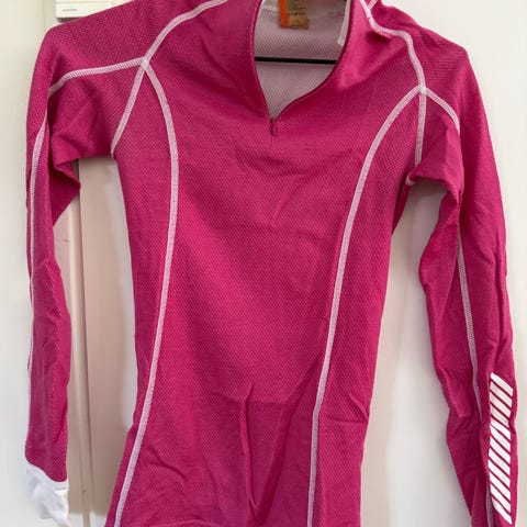 Kari Traa ullundertøy sett for dame i størrelse M. Settet består av langermet overdel og longs. Farge i rosa med mønster og gule kontrastsømmer. Materialet er ullblanding egnet som innerste lag ved ulike utendørsaktiviteter og til hverdagsbruk når det er kjølig.