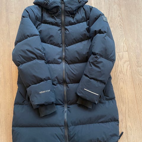 Twentyfour dunjakke for dame i størrelse 40. Jakken er svart og fylt med dun. Modellen har lengre passform, hette og gjennomgående glidelås i front. Ytterstoffet er glatt og vattert i brede paneler. Egnet som varm ytterjakke til hverdagsbruk og utendørsaktiviteter i kaldt vær.