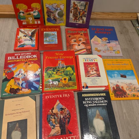 Samling med flere norske eventyrbøker for barn. Bøkene har stive permer og illustrerte forsider. Titler som blant annet «Askepott», «Tre små katter», «Tass og vennene hans» og andre klassiske eventyr. Egner seg som høytlesningsbøker eller egenlesning for barn som liker eventyr og dyrefortellinger. Bøkene er på norsk og har fargerike illustrasjoner på omslagene.