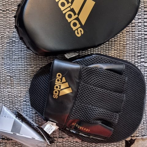 Boksehanskene er i svart med gule striper og Adidas-logo. De har borrelåslukking rundt håndleddet for justerbar og stabil passform.