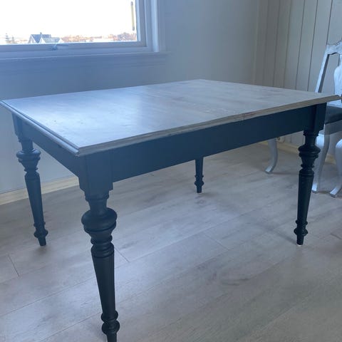 Spisebord i tre med blåmalt bordplate og ben. Rektangulær form med fire ben. Overflaten har synlige merker og slitasje i malingen. Egner seg for videre oppussing eller bruk som det er dersom man ønsker et mer rustikt uttrykk.