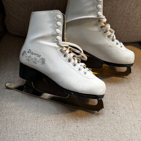 Davos kunstløpskøyter i størrelse 34 for barn. Klassisk hvit modell. I fin stand, men har stått en god stund og trenger sannsynligvis skjerping.